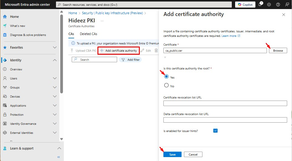 More details: *How to:* [*Configure Certificate Authorities (Microsoft)*](https://learn.microsoft.com/en-us/entra/identity/authentication/how-to-certificate-based-authentication#step-2-enable-cba-on-the-tenant)