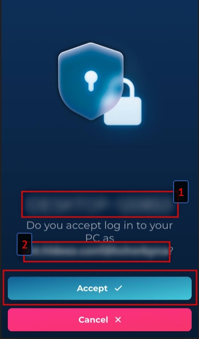 Confirm the login at the Hideez Authenticator: 1 - workstation name, 2 - account name. The workstation name should match the name of the host PC.