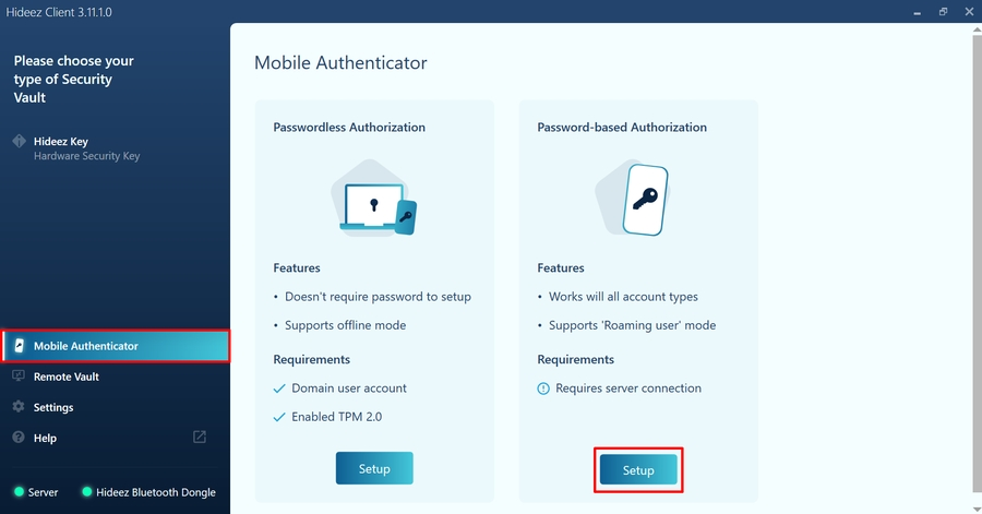 Go to the Mobile Authenticator section and click the "Setup" button under the Password-based Authenticator subsection.