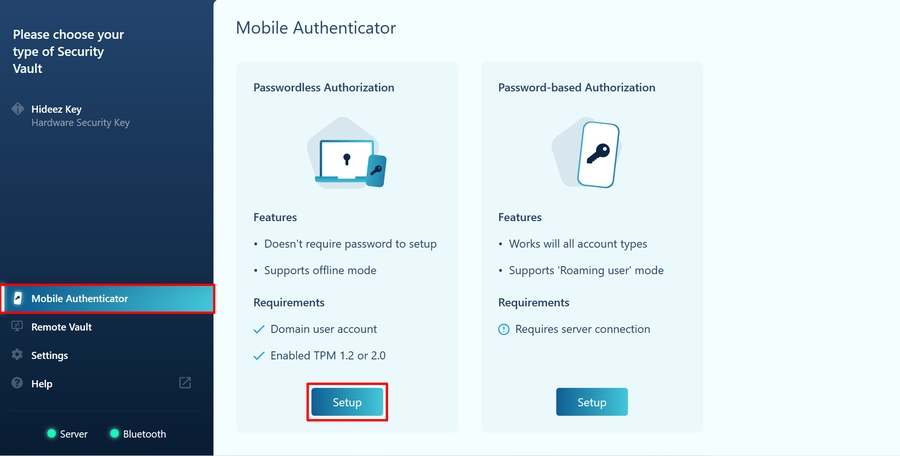 Go to the Mobile Authenticator section and click the "Setup" button under the Passwordless Authenticator subsection.