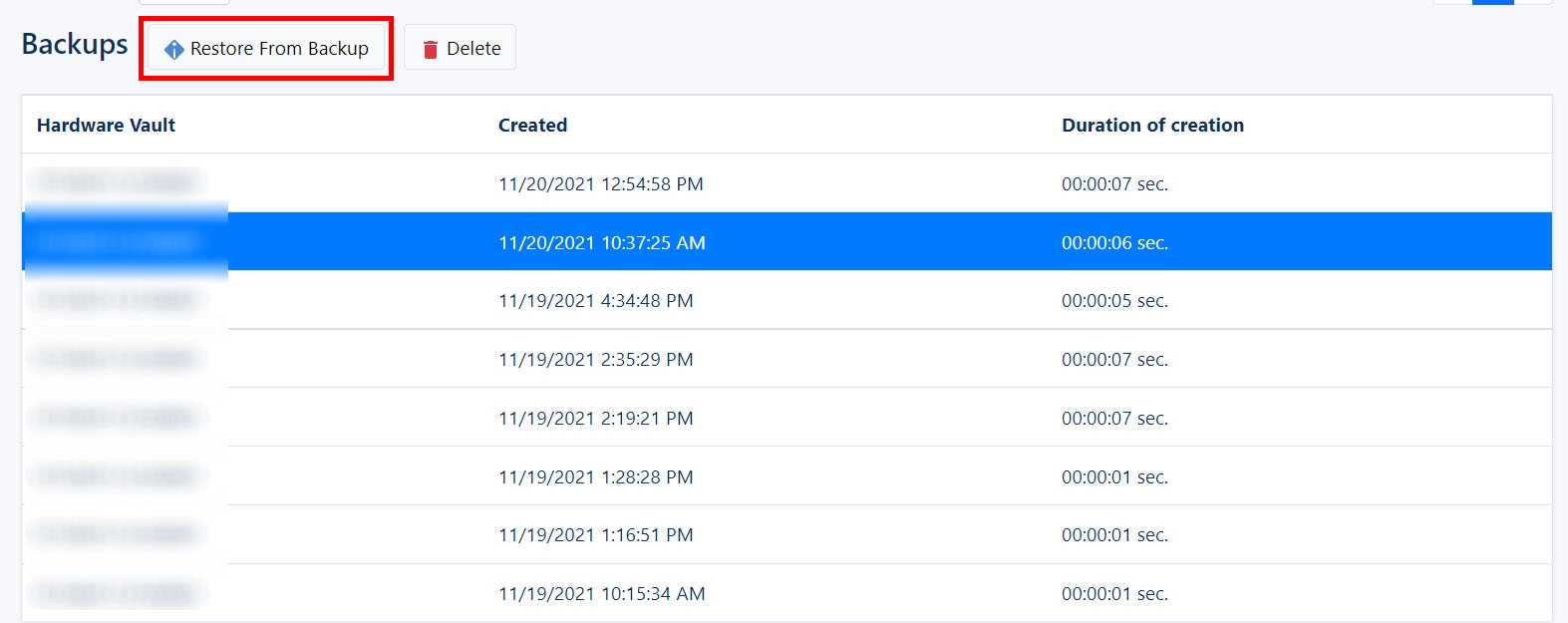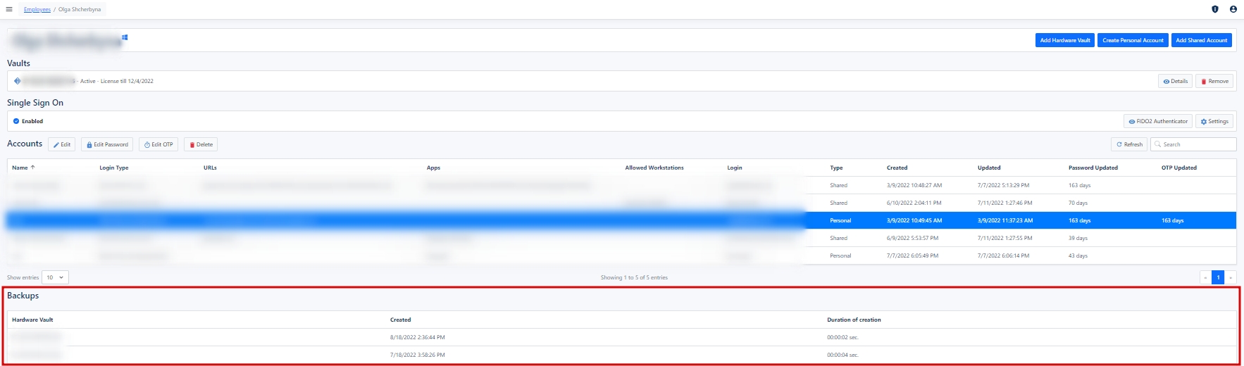 Backup is created automatically every time after connection between the key and workstation established. You just need to connect your key in Client and wait for 2 minutes approximately to backup appearance at employee page. There can be stored up to 10 backups.