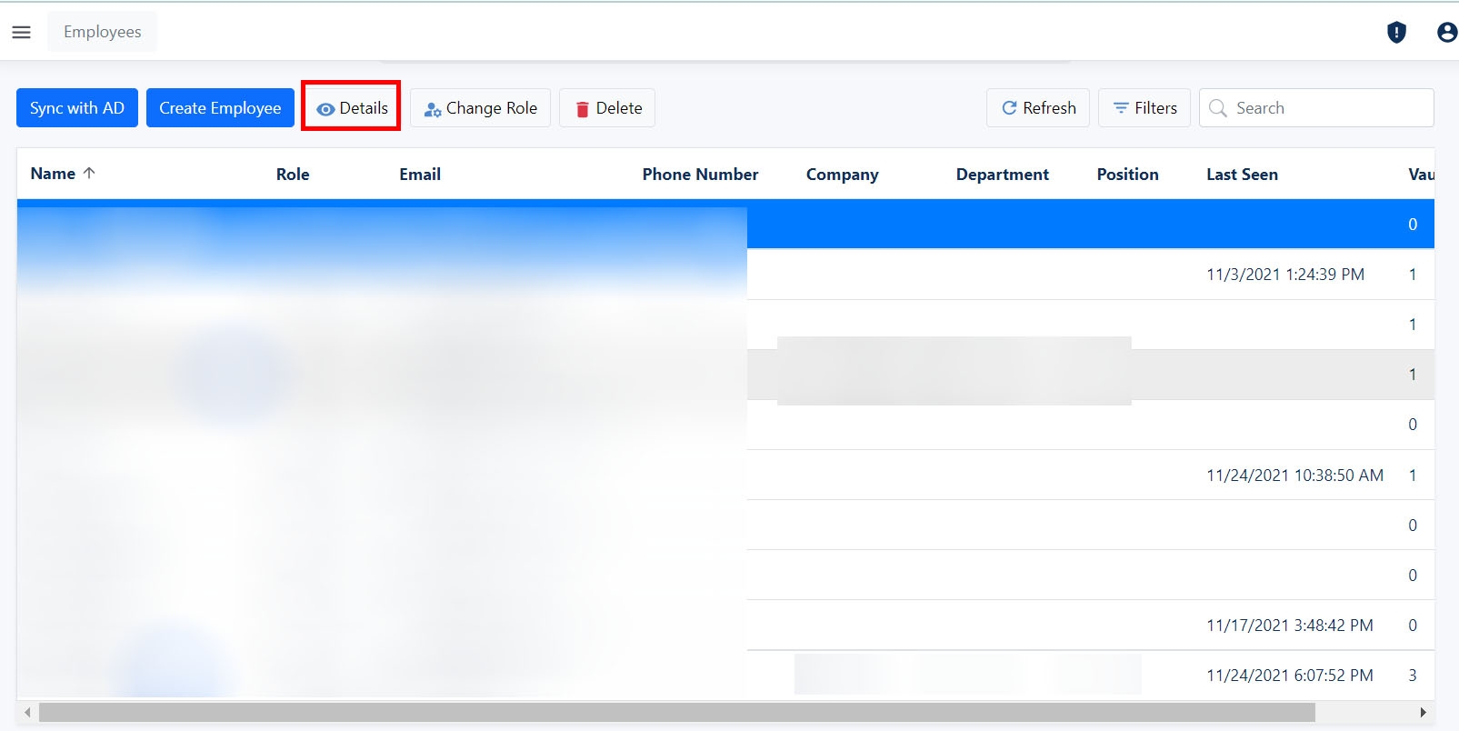 To restore accounts from previously created backup you need to open employee details. Click on the Details button in the Employees section.