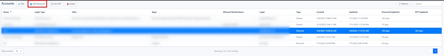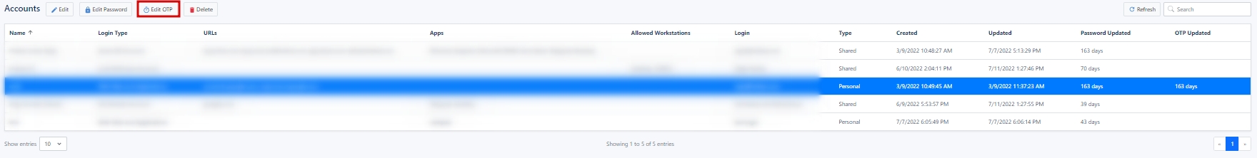 Actions available for accounts: - Edit - Edit password - Edit OTP - Delete