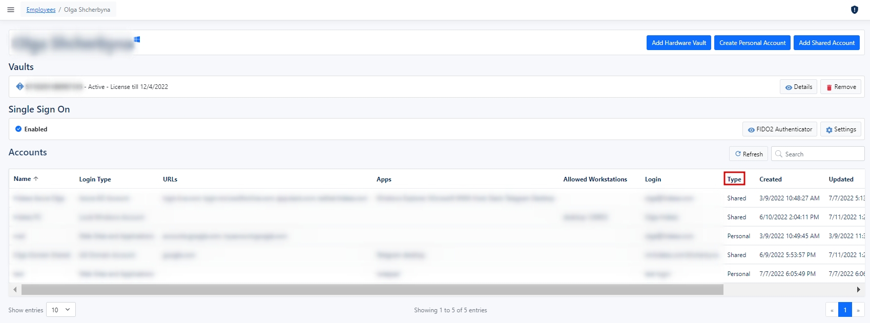 In the column with the account type, you can recognize whether this is a personal or shared account.
