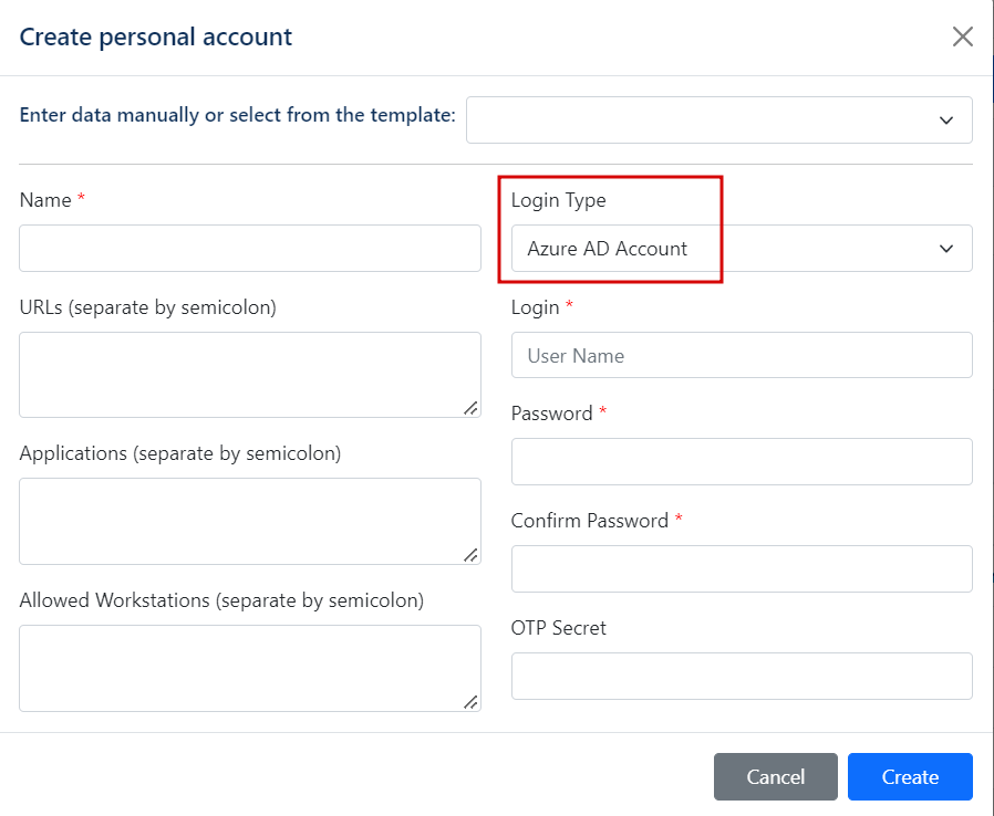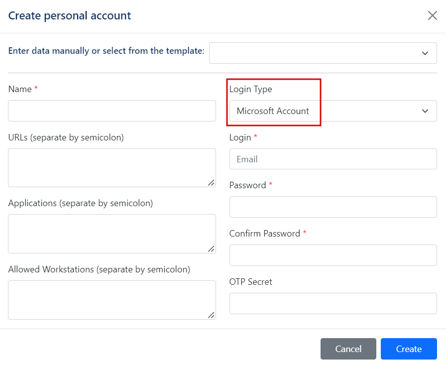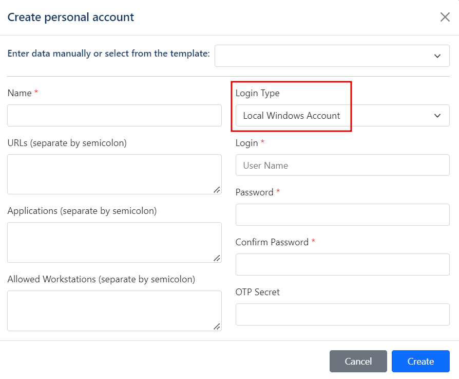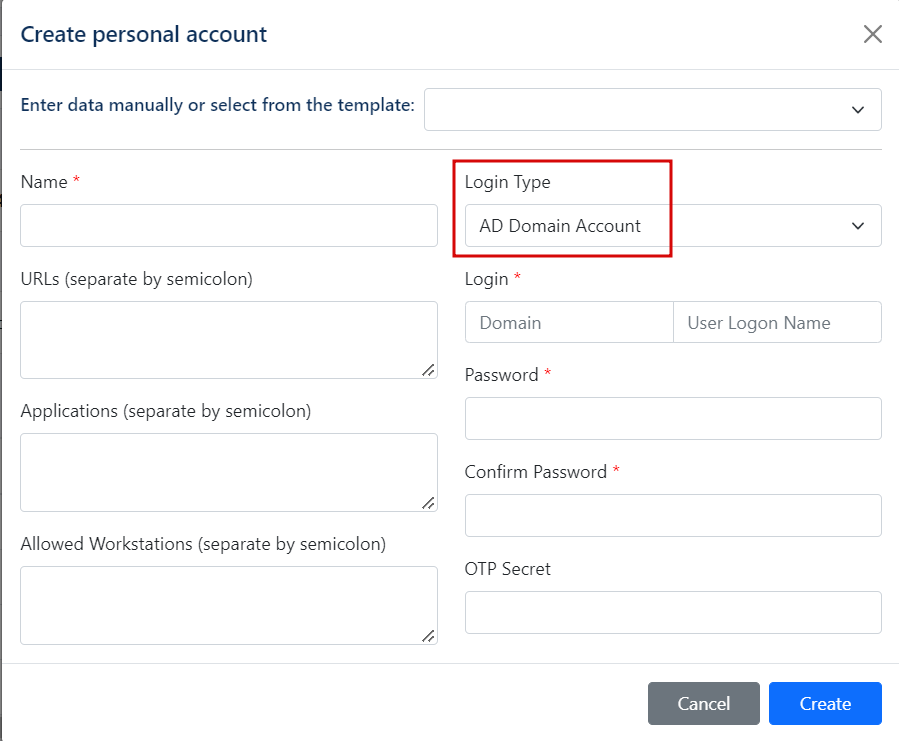 Login Type - the type of login that defines what the account can be used for. Choice from the drop-down list: Web-Sites and Applications / Local Windows Account / AD Domain Account / Azure AD Account / Microsoft Account.
