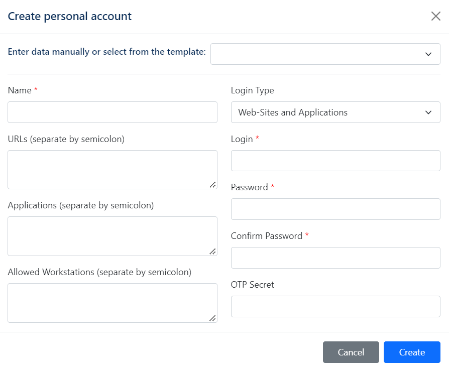 Enter data manually or select from the template - the ability to create an account based on a previously saved template. If the template is not selected, the account is created by manually entering all the data.