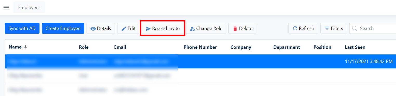 If the email did not reach the specified address or if the invitation has not been accepted for a long time, you can resend it. Click on the line with the required administrator and click the Resend Invite button.