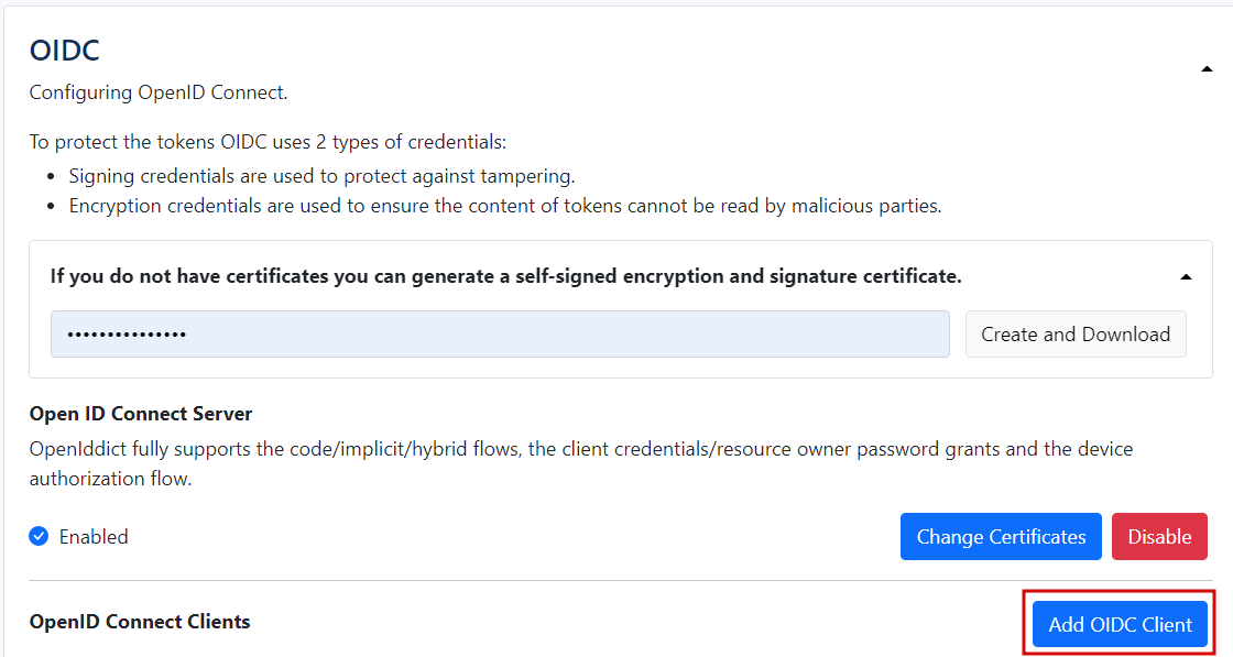 The Openid connect clients (OIDC) parameters can be set at the OIDC section.