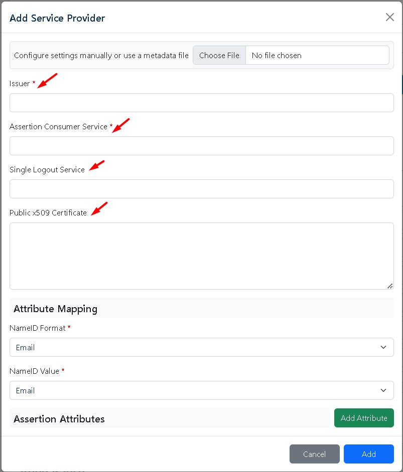 Some Service Providers provide users with metadata files. In this case, all required fields will be filled in automatically after importing the metadata file.