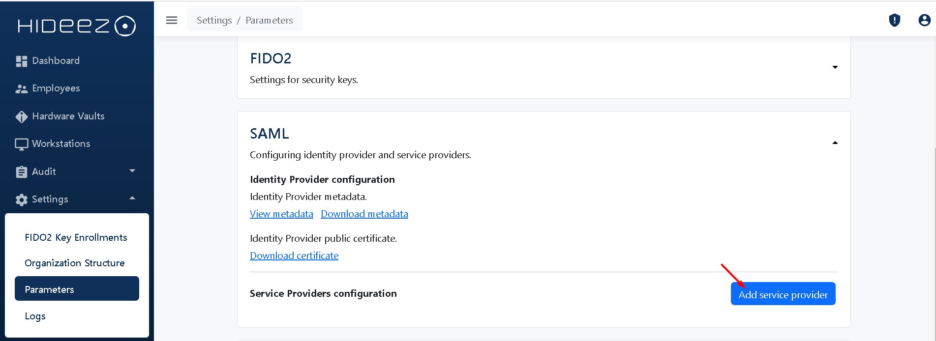 Hideez Server (IdP) and Service Providers (SP, i.e., web applications) must exchange public key certificates or metadata.