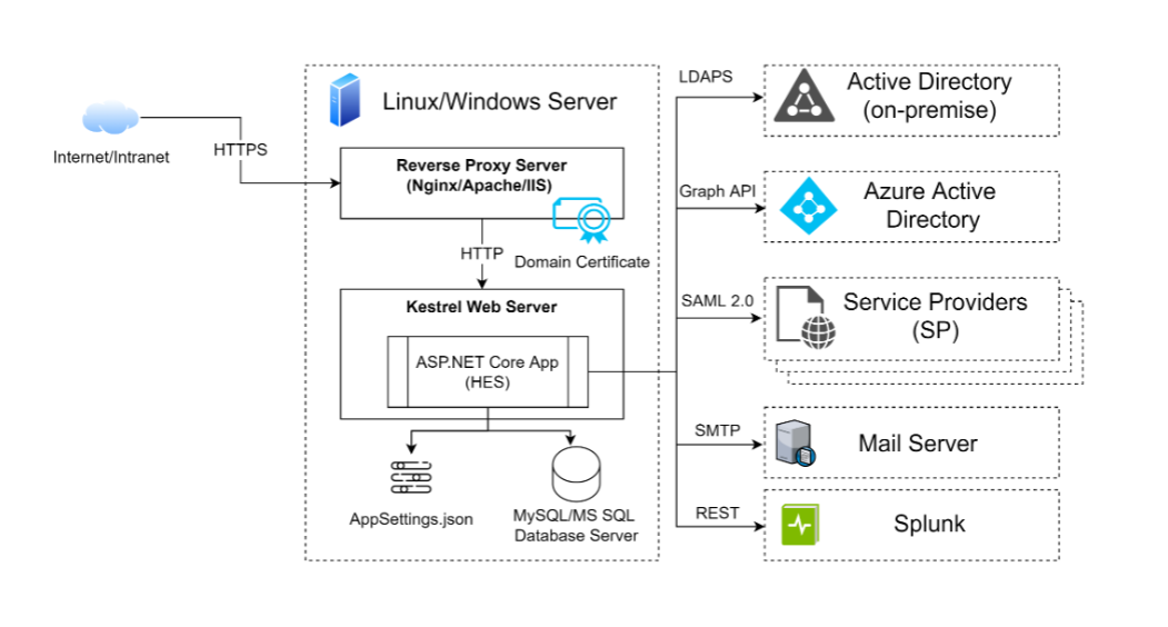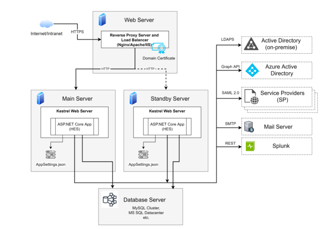 MySQL or MS SQL server can be used as a database. Critical data in the database can be encrypted using the Data Protection mechanism. HES server contains a number of connectors and integrations with other servers:&#x20;
