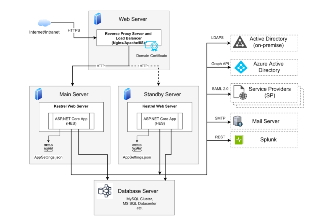 MySQL or MS SQL server can be used as a database. Critical data in the database can be encrypted using the Data Protection mechanism. HES server contains a number of connectors and integrations with other servers: