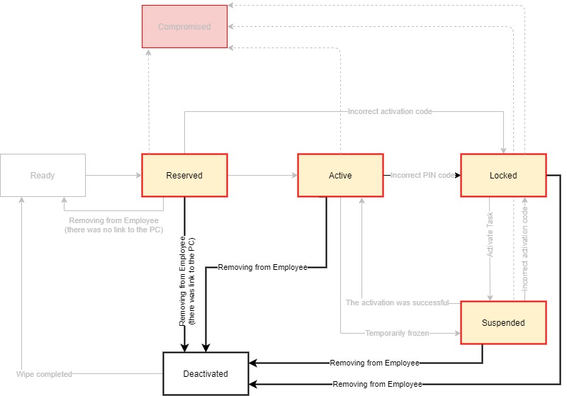Cleaning procedure - Wipe will be executed the next time the Hideez Key is connected in the Deactivated status. If Wipe is successful, the Hideez Key status will change to Ready. Then it can be assigned to a new user. If an automatic wipe procedure fails and Hideez Key remains in the Deactivated status - you need to use the manual Wipe procedure.