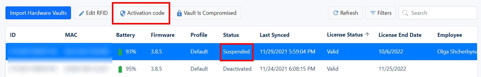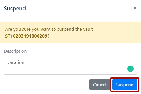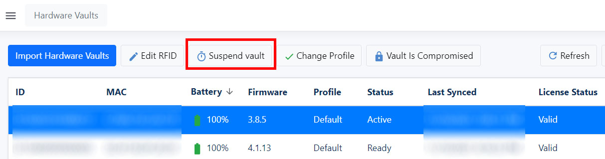 Go to the Hardware Vaults section. Select the required Hideez Key in the Active status. Click on it and click the Suspend Vault button.