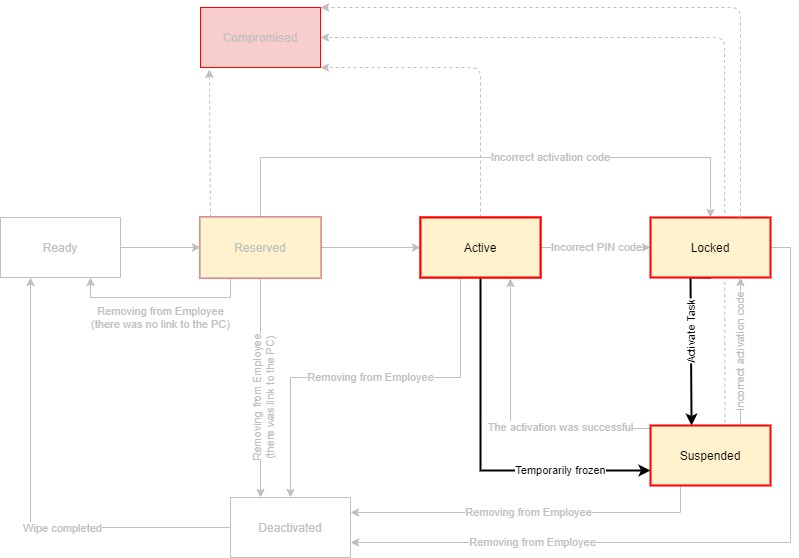Automatic transition Locked -> Suspended. When the Administrator executes the command to activate the locked Hideez Key, the key automatically switches from the Locked status to the Suspended status and remains in it until the user enters the activation code.