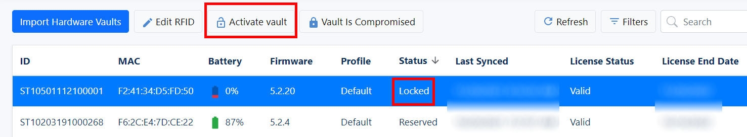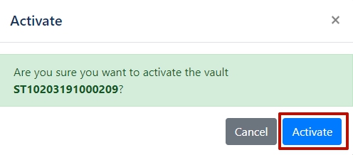 The administrator should find the user key in Hardware Vault section, make sure that it is in the status Locked, click on it and click on the Activate vault button.
