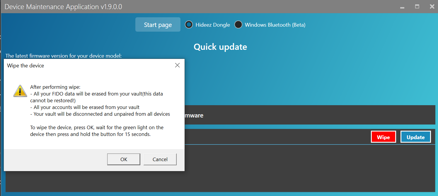 If you are using a Hideez Key that has never been used on the PC where you are trying to perform the wipe process, then after tapping on the dongle, you need to wait for the green blinking, confirm by pressing and then continue.