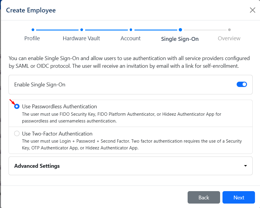 To enable passwordless authentication, check the "Passwordless Authentication" checkbox.