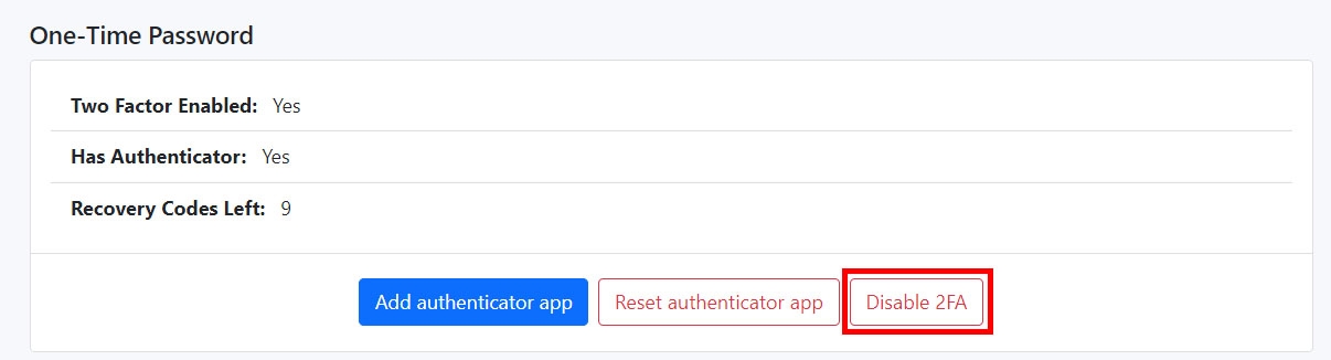 To disable two-factor authentication on the HES server, go to the One-Time Password section and click Disable 2FA.