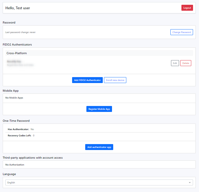 After successful sign in you can configure all these login options, change password, see the list of registered security keys in the "FIDO2 Authenticators" section (cross-platform and platform separately) and enroll new device (for example, smartphone) for single sign on, change page language, etc. Just choose desired setting and follow the instructions on the screen.