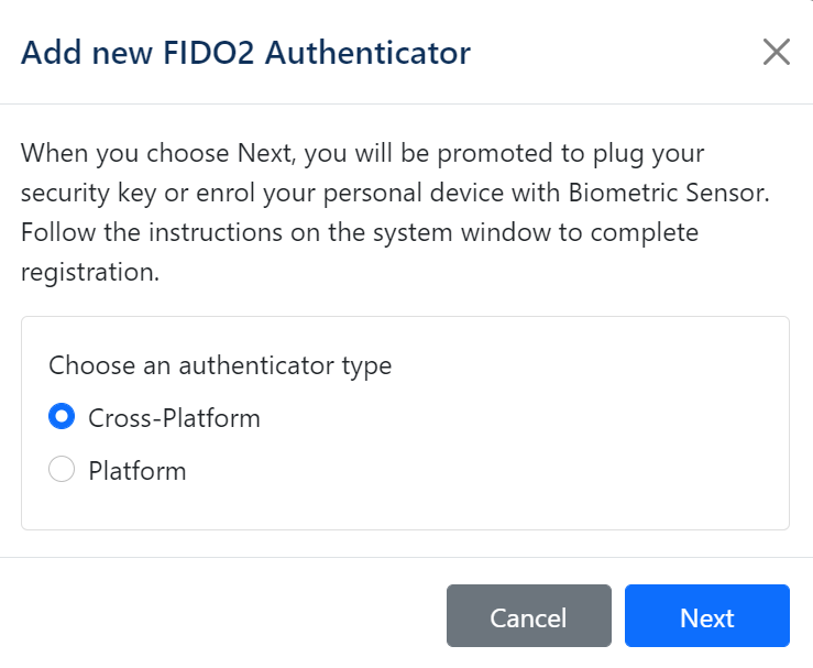 If you have a hardware security key (for example, Hideez Key) or your smartphone as a Passkey, choose the "Cross-Platform" option.