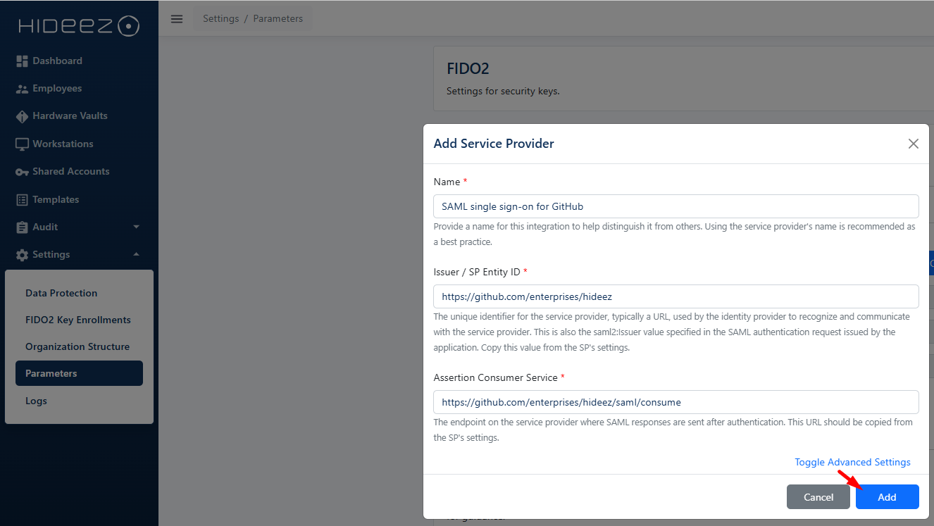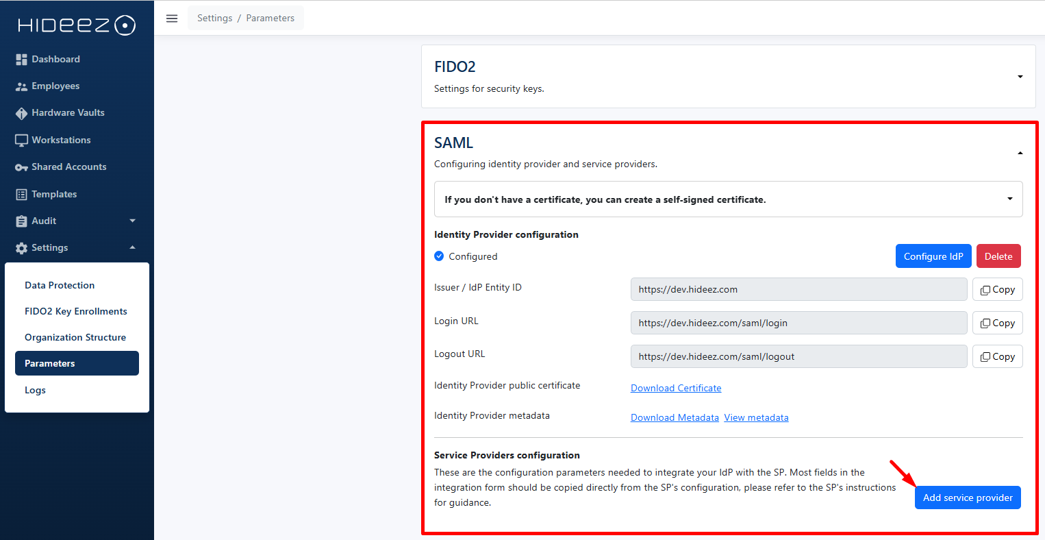 ### Step 2: Configure the SAML Settings in Hideez Enterprise Server