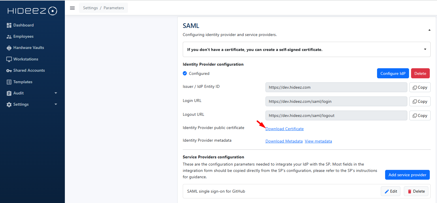 4. Go to the section `Identity Provider configuration` and download the Hideez Enterprise Server signing certificate (in X.509 format).