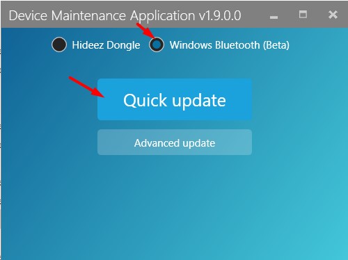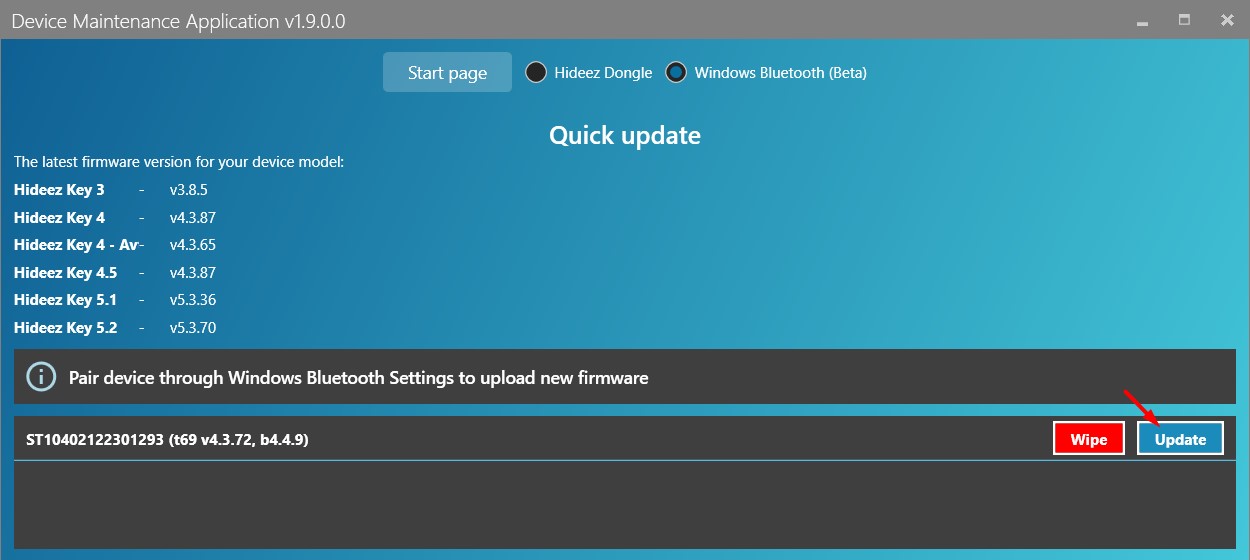 Navigate to Program Files → Hideez > Client → and run Device Maintenance Application. Select Quick update and click Update.