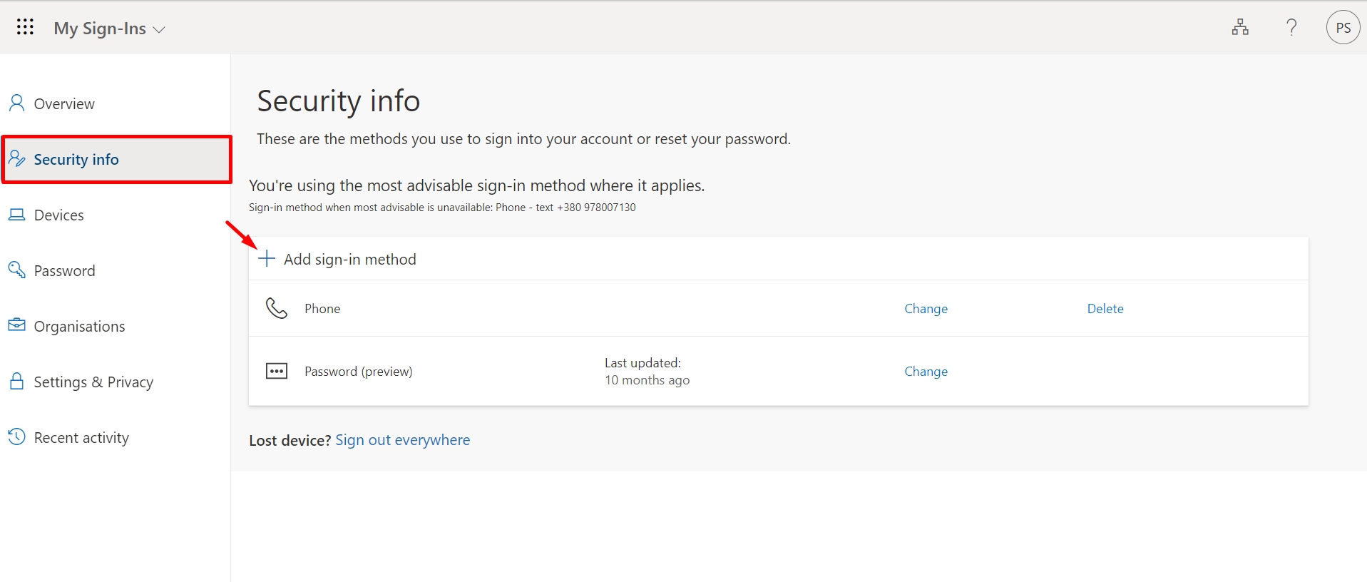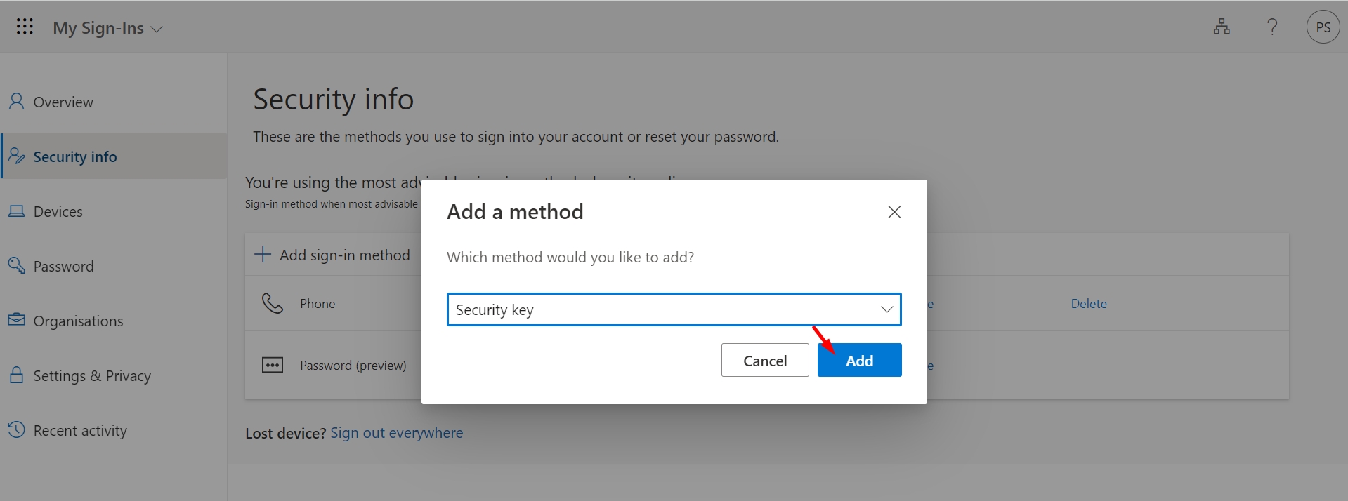 Key added to myaccount.microsoft.com :