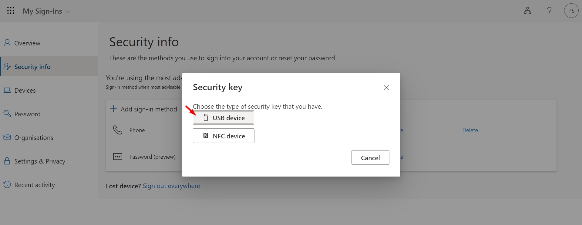 The administrator has specified for you the authentication method in Azure Active Directory - Security key. (Contact the Administrator to clarify this).