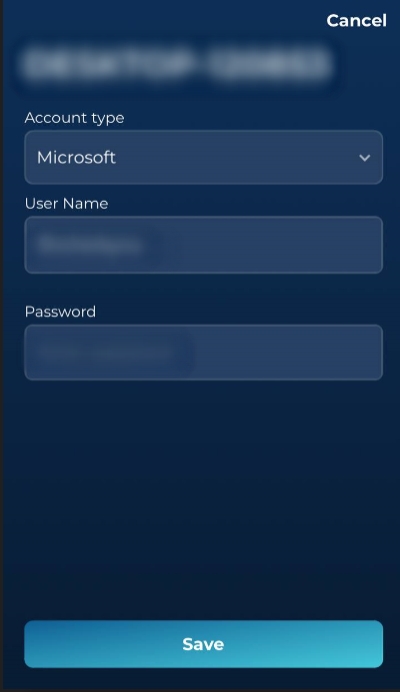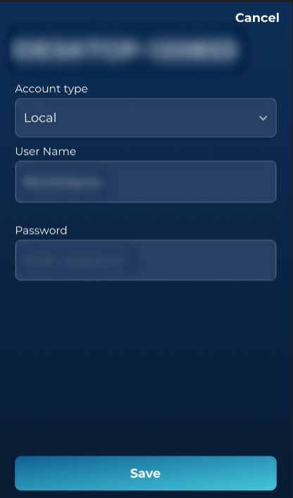 Confirm enrollment on Hideez Authenticator. Select account type (Local/Domain/Microsoft/AzureAD) and fill in all the fields. Then tap the "Save" button.