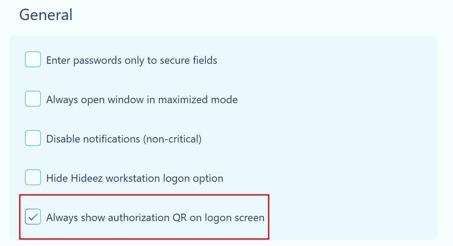 Assure that in the Hideez Client settings in the "General" section "Always show authorization QR on logon screen" parameter is enabled.