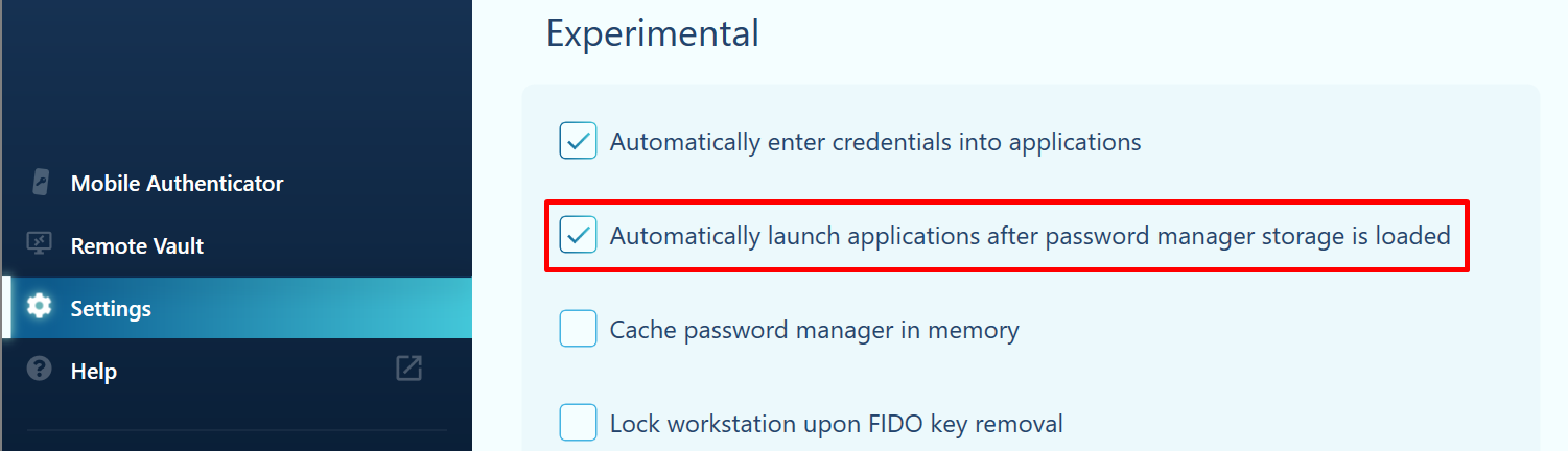 Open Hideez Client settings page, scroll down to ‘Experimental’ section and select ‘Automatically launch applications after storage is loaded’ option